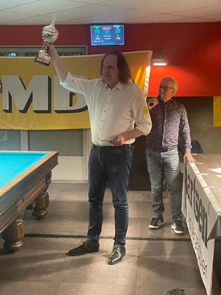 Na een korte plaspauze kon het publiek zich nu op gaan maken voor de finalepartij in de Hoofdklasse. Onder de deskundige leiding van arbiter Tilo Machielse, maakten titelverdediger Hans Frijters en zijn uitdager Bob Roovers zich klaar voor een geweldige laatste partij van dit kampioenschap. En het werd een zeer hoogstaande partij. Hans, die het toernooi zeer matig was begonnen, doordat hij, nu hij pas gepensioneerd is, een beetje overtraind leek, startte meteen met een serie van 4. Bob klampte meteen aan. Er ontspon zich een enorme strijd tussen deze twee matadoren. Na 6 beurten leidde Hans weer met 8-5, maar Bob draaide het in de 10e beurt weer om (10-9). Met twee prachtige series van 5 en 4 in de beurten 13 en 14 kantelde de wedstrijd in het voordeel van Bob. Met een voorsprong van 21-11 na 15 beurten (!) leek de strijd gestreden en toen Bob in de 16e beurt weer een serie van 3 op tafel legde was de buit binnen, dacht hij. Maar dan ken je Hans Frijters nog niet, want met een mooie serie van 6 pareerde hij die serie in dezelfde beurt. De voorsprong van Bob was toch te groot, want in de 18e beurt volbracht Bob zijn 25e carambole en omdat Hans in de nabeurt na 2 caramboles stokte, was de titel voor Bob definitief binnen. Iedereen was het er over eens, dat Bob het gehele toernooi een zeer hoog niveau had laten zien (gemiddeld 1.187) en zich daardoor de terechte Driebandenkampioen van Ulvenhout mag noemen. Bob was ook de winnaar van de JUMBO Progressieprijs, voor de speler die ten opzichte van het vorig toernooi, de meeste progressie in gemiddelde had gemaakt.