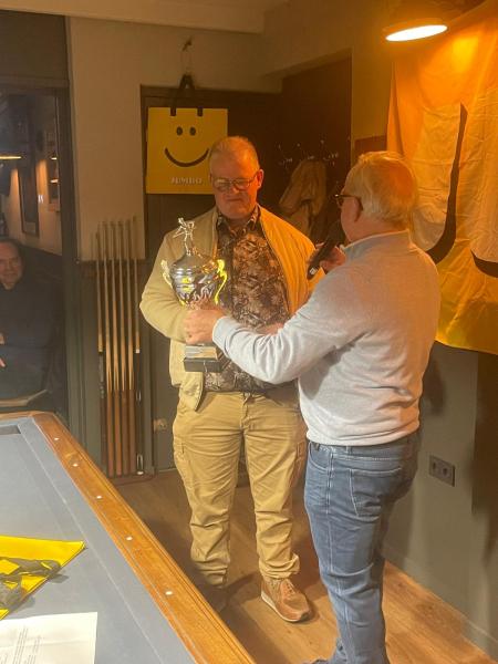 De eerste partij van deze slotavond was de finale in de D-klasse tussen Niels Vergouwen en Jan ten Bosch. Jan, die als fysiotherapeut al menig Ulvenhouter onderhanden had genomen, zou nu een zware kluif krijgen aan het enig lid van de “bende van Galder”, dat de finalefase had bereikt, nl. Niels Vergouwen. Beide spelers hadden een grote schare supporters meegebracht en er ontspon zich een marathonpartij, die tot halverwege (beurt 30) gelijk opging (6-5). Welke speler zou het beste tegen de druk kunnen. Het zijn dan soms kleine zaken, die de boel doen kantelen. Niels maakte een paar lucky-shots en dat gaf misschien wel de doorslag. Aangemoedigd door zijn trouwe supporters kroop hij naar de eindstreep en met een mooie laatste carambole besliste hij de partij in de 59e beurt (12-8). De kampioen in de D-klasse komt dit jaar dus uit Galder! Proficiat Niels!